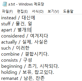 안에 내용은 단어 / 뜻 순으로 넣어야하며 단어와 뜻을 /(슬래시)로 구분하기 때문에 중간에 꼭 넣어주어야한다.